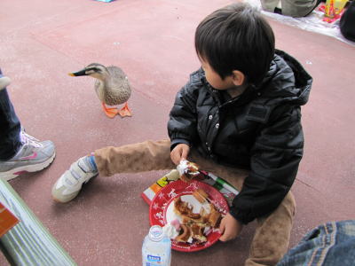 KOU君が地べたに座って美味しくワッフルを食べてたらカモがやってきました。