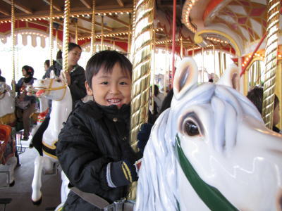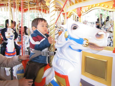 2人で乗れる外側の馬は全部無くなっちゃったので、KOU君もKEIたんもパパとママに支えてもらって1人のり。