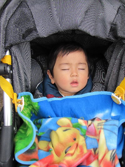 いつもならもうちょっと元気でいられるはずなんだけど、昨日の夜ディズニーランドに行けるという興奮が冷めやらず、なかなか寝なかったKOU君。全員で布団に入って横になっても、1人で2時過ぎまでゴロンゴロンしてたKOU君。さすがに睡魔に襲われて、ベビーカー乗ったら、あっさり寝てしまいました。