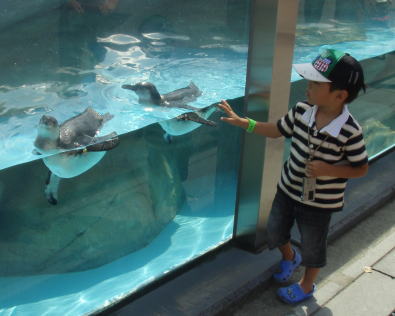 KOU君はペンギン見たらちょっと元気になってきて、「まま~ぺんぎんずのたいちょうがいるよ~。」と。