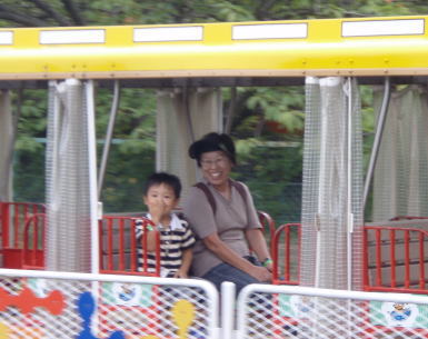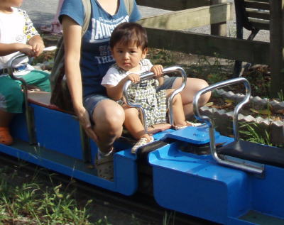 気を取り直して、せっかく来たからKEIたんにも何か乗り物乗せてあげようということで、ママと一緒に汽車ぽッぽに乗ってみました。