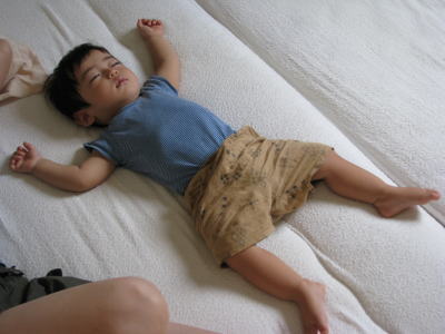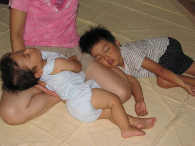 KEIたんもKOU君もママの足を枕にして寝てしまいました。