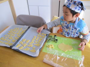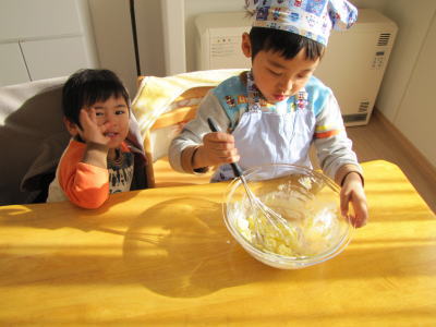 生地をこねこね。KEIたんは横で余裕の見学です。