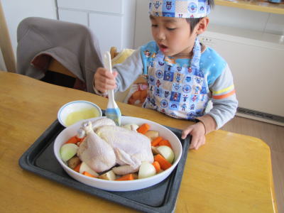 クッキーが終わったら、今度はチキンにバターを塗る作業。