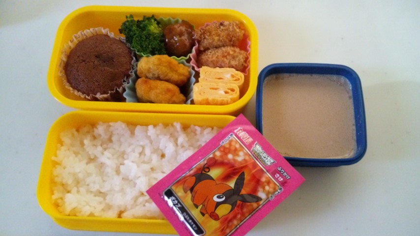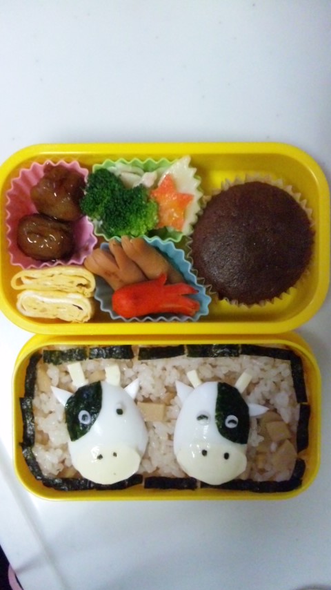 牛の乳しぼり体験やバター作りにちなんで、牛さん弁当にしました。