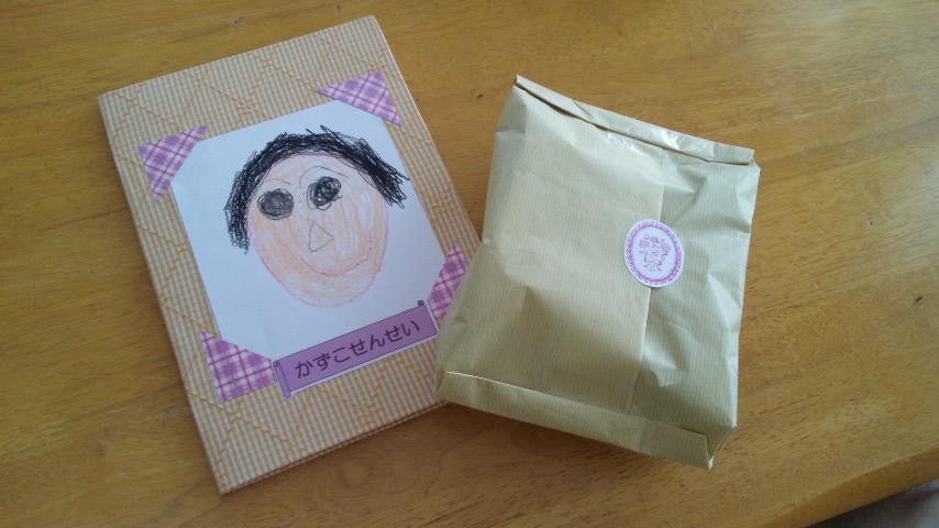 昨晩ママと大慌てで作ったメッセージカードとプレゼントを持って行ってきました。