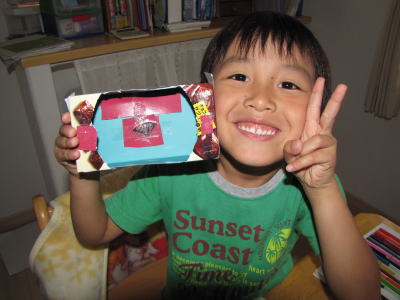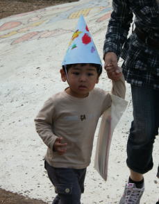 園児さんが作ってくれた三角帽と、お絵描き帳を頂きました。