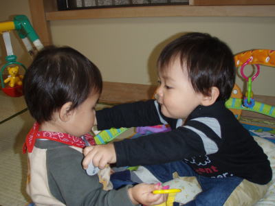 1人がおもちゃ持つと、もう1人がそれに興味を持ったり、