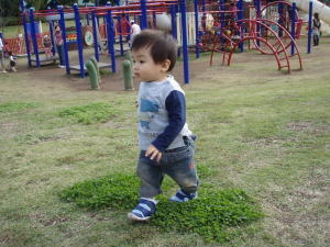 銀杏の葉っぱを拾ったり、犬を見て追いかけたりと、とっても嬉しそう