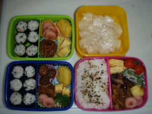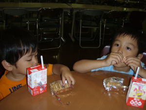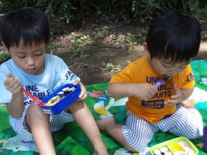 お水遊びを満喫した後、すっごい勢いでお弁当にがっついた2人。