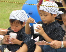 予想通りの猛烈な暑さだったので、子供達が始まる前にウダウダにならないようパパがかき氷を買ってきてくれました。