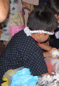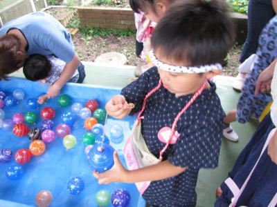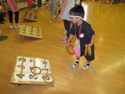 ヨーヨー釣り、ボーリング、宝探し、輪投げなどなど、お祭り委員のお母さん達が用意してくれたゲームを、