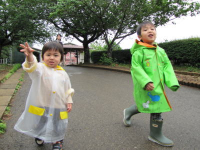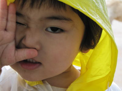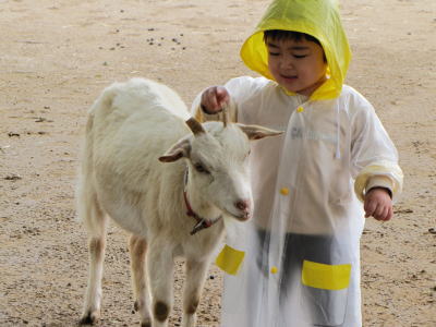 がっ、楽しんでいたKOU君にヤギさん達が寄ってきて、雨がっぱをパクッ!