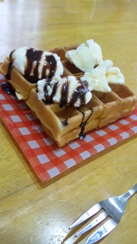 以前にオーストラリアで食べた、まぁるい大きなワッフルにドカッとアイスがのったやつを思い出してしまった。