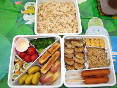 なんとなく茶色っぽいお弁当になっちゃったけど、子供達の好きな物を入れたので、