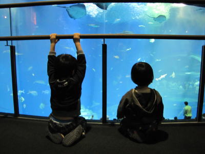 大水槽の前では、2人ともどっかり座って、エイとかサメとかじっくり見てました。