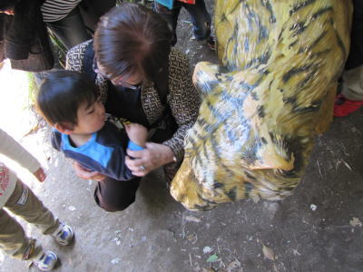 作り物の虎にビビるKEIたん。